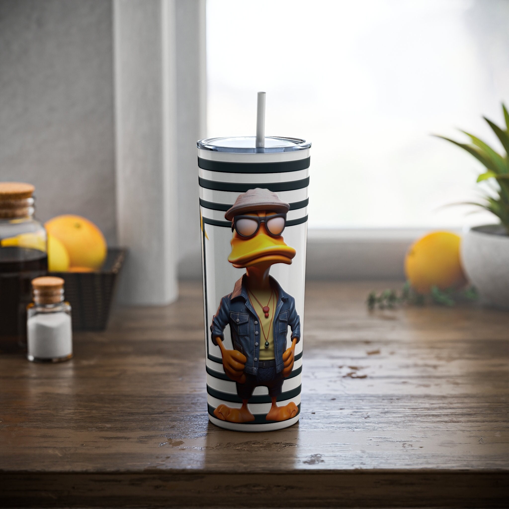 A super cool duck coach print is featured on this skinny tumbler can hold 20oz of liquid and follow along on any adventure thanks to its robust, 18/8, food-grade steel construction. Its plastic lid prevents spills while the included straw makes sipping on the go a blissful affair. All materials are non-toxic and BPA-Free for daily use and peace of mind. Each tumbler has a matte UV-print finish.